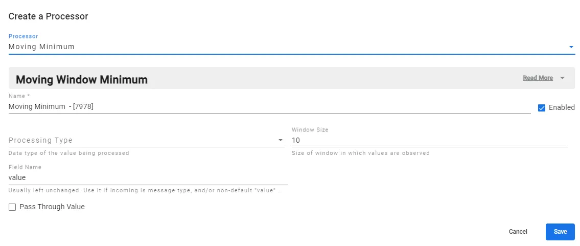 the moving window processors perform calculations over a sliding or moving window of data from your plc device moving window overview single inputs are to be provided with the events type connection and then the respective functions are calculated as the names suggest use one of the following processors for your inputs moving average gives you the average of the inputs values in the flow moving maximum gives you the maximum value among the inputs in the flow moving minimum gives you the minimum value among the inputs in the flow the following information describes these processors for field name , you can enter the field name for which you want to apply the function the field name must be available in all the inputs for example, value , deviceid , or success for processing type , you can select from float , signed (signed integer) or unsigned (unsigned integer) for window size , enter the number of values you want the function to consider connect the input to the function using the events connection connect the function to the output using the events connection moving window parameters parameters details processing type this parameter refers to the data type of the value being processed window size this parameter determines the size of the window in which calculations are performed the window size represents the number of seconds over which the calculations are carried out field name this parameter is usually left unchanged it is used if the incoming data is of message type, and/or if a non default "value" field name is being used note when creating an analytics flow with moving window processor, refer the docid\ qefdhlbmpybw50lqvz oc guide for more details